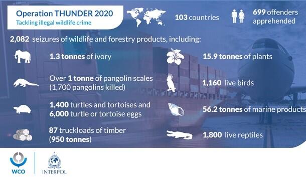 THUNDER 2020 was a global environmental monitoring operation coordinated by the WCO and INTERPOL on a large scale, which was simultaneously implemented by several customs administrations across multiple jurisdictions, mobilising 103 countries against wildlife and forest crime, under the global customs theme of the year: “Customs promote the Sustainability of People, Prosperity and the Planet”.